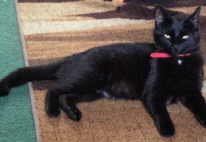 In June of 2014, I found a very small kitten in the parking lot of a Hardee’s. She is all black except for one small patch of white on her breast. I brought her home. I didn’t see her mother anywhere. If I’d left her she might have gotten run over by a car. The only reason I found her in some hedges against the building is that she was crying out. She looked really scared when I found her. When I got her home she was quite hungry. She would eat until her little belly could hold anymore. So I learned to give her just enough to satisfy her hunger.